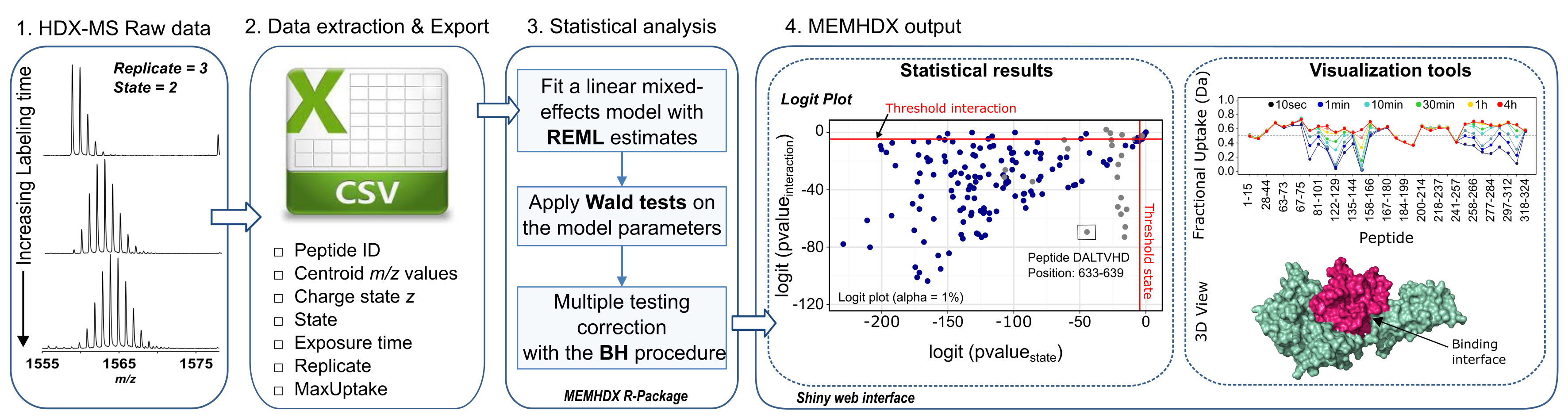 MEMHDX workflow: A .csv file containing deuterium uptake values for all identified peptides is exported after raw data extraction and analysis by dedicated HDX-MS software (e.g., DynamX). The .csv file is uploaded to MEMHDX where a linear mixed-effects model is applied to statistically validate the dataset. Main results are displayed on a 'Logit representation' (for data clustering and validation) and visualized using a global summary plot and the 3D structure, where available. A user-friendly ShinyInterface facilitates the use of the application.